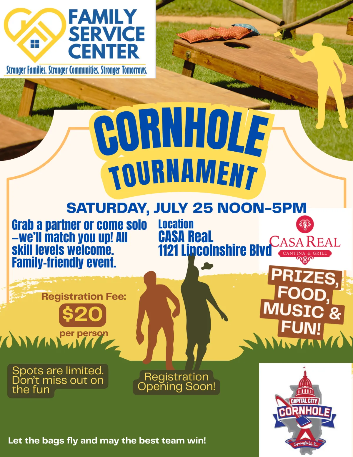 Join Family Service Center for a day of fun brought to you by Capitol City Cornhole & CASA Real. Players of all skill ranges are encouraged to come, we will match you up based on skill level!